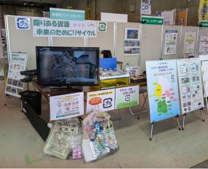 当社は、山形県内の3地域(14市町)から分別収集したプラスチック製容器包装を引き取り、リサイクル(再商品化)しています。その縁もあり、ここ最近は毎年出展させていただいております。当社の出展ブースでは、事業内容やリサイクル方法に関する動画放映のほか、家庭から排出されるプラスチック製容器包装のマテリアル(材料)リサイクルの紹介パネル、リサイクル製品のサンプルなどを展示しました。