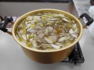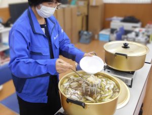 訓練の後は、これも恒例となりましたが、お昼に会社で準備したお弁当と一緒に、社内で調理した『いものこ汁』を社員全員で味わいました。