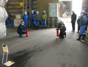 当社では、自衛消防訓練を通じて、迅速かつ的確な消防活動ができるようにするとともに、防火体制の確立と防災意識の高揚を図ることを目的として、毎年訓練を実施しています。火事が起こった時に行うべき基本的な行動である通報、初期消火、避難について訓練を行ないました。